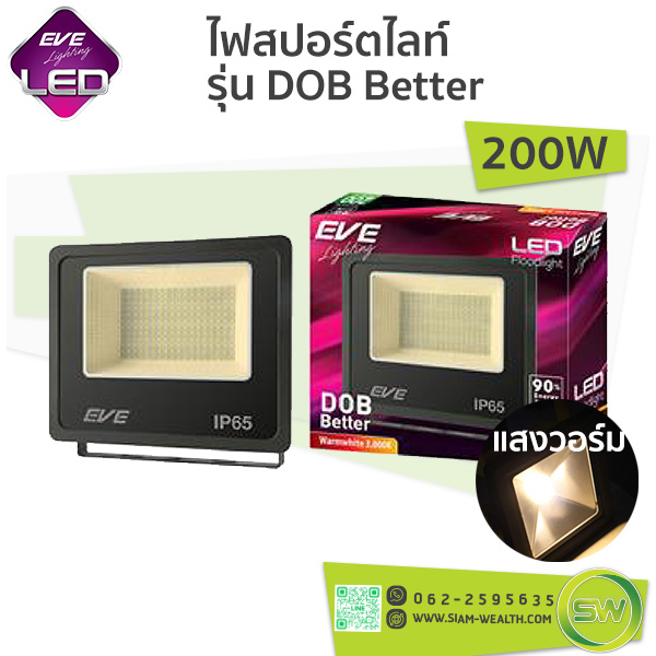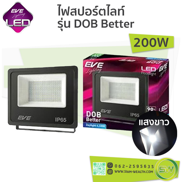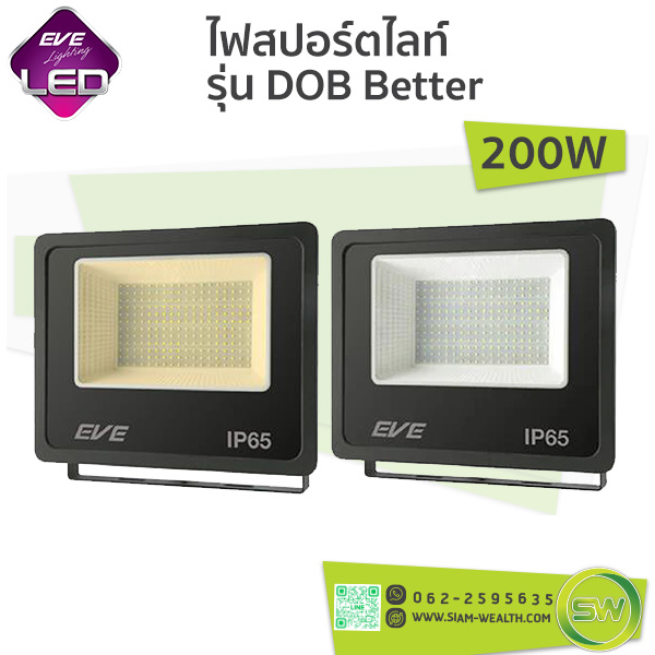 ไฟสปอร์ตไลท์-EVE-LED Floodlight รุ่น DOB Better ตัวโคมสปอร์ตไลท์ผลิตจากอลูมิเนียม หล่อขึ้นรูป มีความแข็งแรง ทนทาน ด้านหลังตัวโคมมีแผงระบายความร้อน สามารถระบายความร้อนได้ดี ช่วยยืดอายุการใช้งานของเม็ดแอลอีดี (LED) ได้นานยิ่งขึ้น มีขนาดกระทัดรัด น้ำหนักเบา ขายึดสปอร์ตไลท์ ผลิตจากเหล็กพ่นกันสนิม ปรับมุมเงยได้ถึง 180° สามารถยึดกับพนังหรือยึดกับพื้นได้ มีแสงให้เลือก 2 แสง ได้แก่ แสงขาว (Daylight) และ แสงส้ม (Warm White) มาตรฐานกันน้ำกันฝุ่น IP65 เหมาะสำหรับติดตั้งภายใน และ ภายนอกอาคาร ในบริเวณที่ต้องการแสงสว่าง เช่น สวนสาธารณะ ป้ายโฆษณา สนามกีฬา หรือ เขตก่องสร้าง เป็นต้น