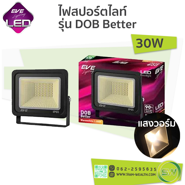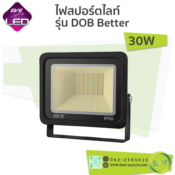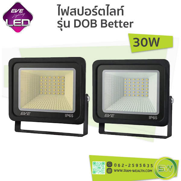 ไฟสปอร์ตไลท์-EVE-LED Floodlight รุ่น DOB Better ตัวโคมสปอร์ตไลท์ผลิตจากอลูมิเนียม หล่อขึ้นรูป มีความแข็งแรง ทนทาน ด้านหลังตัวโคมมีแผงระบายความร้อน สามารถระบายความร้อนได้ดี ช่วยยืดอายุการใช้งานของเม็ดแอลอีดี (LED) ได้นานยิ่งขึ้น มีขนาดกระทัดรัด น้ำหนักเบา ขายึดสปอร์ตไลท์ ผลิตจากเหล็กพ่นกันสนิม ปรับมุมเงยได้ถึง 180° สามารถยึดกับพนังหรือยึดกับพื้นได้ มีแสงให้เลือก 2 แสง ได้แก่ แสงขาว (Daylight) และ แสงส้ม (Warm White) มาตรฐานกันน้ำกันฝุ่น IP65 เหมาะสำหรับติดตั้งภายใน และ ภายนอกอาคาร ในบริเวณที่ต้องการแสงสว่าง เช่น สวนสาธารณะ ป้ายโฆษณา สนามกีฬา หรือ เขตก่องสร้าง เป็นต้น